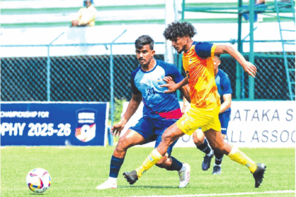 Goa and Services players try to overpower each other to take control of the match at Bangalore Football Stadium, Bengaluru,…