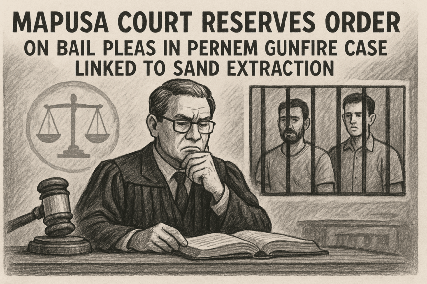 The Mapusa Additional Sessions Court has completed hearing arguments on the bail applications of Gangaram Mahale, Ashish Mahale, Akash Mahale, Nehal Mahale and Rishikesh Mahale, all of whom were arrested by Pernem Police for their alleged involvement in a gunfire incident related to sand extraction. The shooting had left two individuals injured.