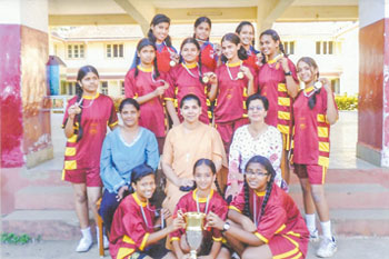 | Fatima Convent HS, Margao, winners of State under-14 throwball tournament organized by DSYA. They got the better of Sharda Mandir School in the final. The team consisting of Rachel Raposa, Nipha Quadros, Alvina Almeida, Sinmral Fernandes, Saidee Patel, Bakitha Alfonso, Analisa Noronha, Leeann Pereira, Atisha Shaikh, Marelli Gracias, Amisha Lotlikar and Giselle Cardozo alongwith Damaciana D’Melo, PE teacher, Sr Regina Greta, headmistress and Nina Coutinho, PE teacher. |