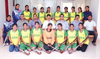 | HOCKEY SQUAD: The 20-member Goa U-20 team selected by Association for Control of Hockey in Goa (ACHG) in collaboration with SAG for Indian Hockey Federation’s Women’s Hockey Championship from January 10 to 18 in Hyderabad. Standing (l to r) Arlene Mendes (gk), Cybil D’Souza, Lavita Shriodkar (vice-captain), Mabel Luis, Pradika Parmekar, Lorenta Pinto, Maheshwari Haldankar, Cynara Gonsalves, Natasha Rodrigues, Pradnya Maulingkar. Sitting – Manjita Mathkar (captain), ACHG general secretary Anselm Gabriel, SAG Dy Director Bruno Coutinho, SAG Executive Director Elvis Gomes, ACHG president Sigmund de Souza, SAG assistant secretary Navin Acharya, coach Anthony Francis Vaz. Squatting – Dakshata Naik, Anjali Shetgaonkar, Laksha Gauns, Akshaya Shetgaonkar, Dipika Gauns, Rishika Kanolkar, Shivani Sharma. |
