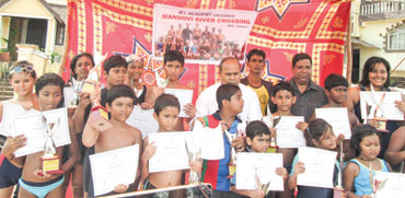 | The 18 students, who swam across the Mandovi river, covering a distance of one kilometer organized by MI Academy, Porvorim. The swimmers: Simrran Kadam, Savio Carvalho, Valeska Trindade, Vinicio Trindade, Anthony Lazarus, Aditya I Ambiger, Shidk A Kalanguthkar, Architt Vashishtha, Valdmir Kazankina Anand, Anhita Kalidas Raikar, Tanmay Kalidas Raikar, Swizel A Pinto, Shynel C Pinto, Amie M Monteiro, Karl A De Souza, Jonathan Dais and Joel E Monteiro. They were trained by Loretto Cardozo. The swimmers alongwith Fr Conceicao D’Silva and Tony Fernandes. |