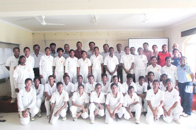 | The participants of under-14, under-16 and under-19 girls summer residential camp organized by Goa Cricket Association alongwith Vinod Phadke, GCA president, Dr Shekhar Salkar, vice-president, Chetan Desai secretary, Anagha Arlekar, joint secretary at GCA Academy, Porvorim, Thursday. |